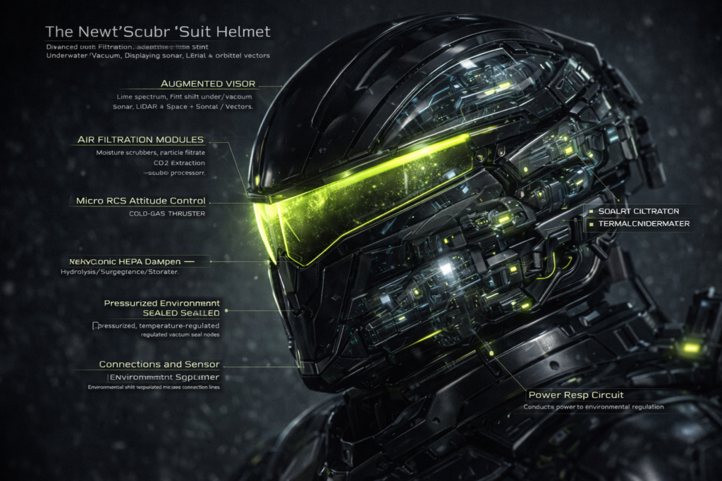 The Augmented Visor gives a clear 20/20 view of variable distances controlled through the VC2S (Voice Command System) the Diver uses when exploring. With more than 17 Research Facilities around the world today having the needed materials and equipment, the use of any Visor matching the NEWTSCUBR©® has to be from the Oakley-designed visor for Axiom Space’s AxEMU suit, though the visor for that particular suit could be made smaller for this suit.